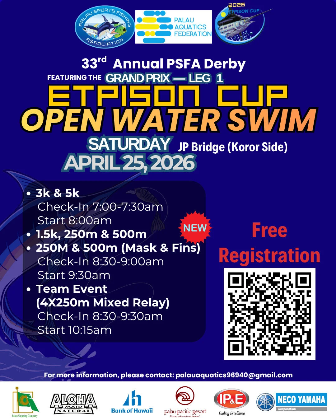 The Etpison Cup Open Water Swim brings together swimmers of all levels to compete in a safe and engaging open-water environment, highlighting Palau’s marine setting and active lifestyle.